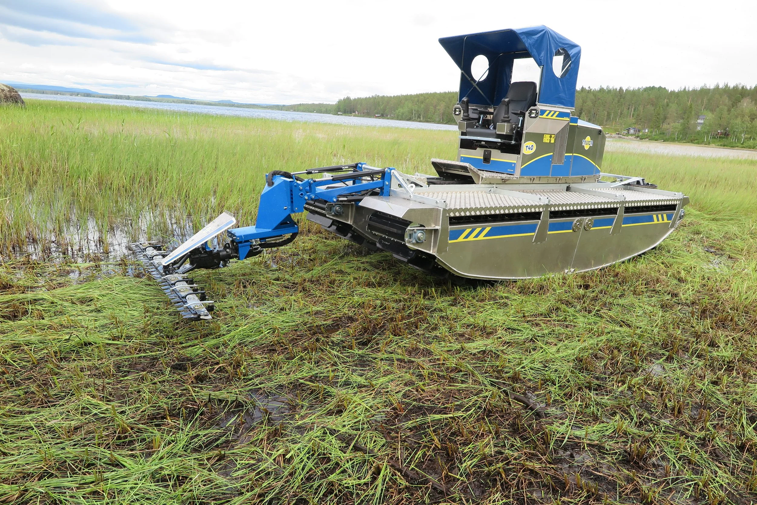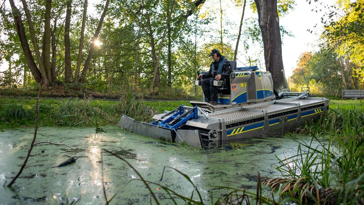 Its unique construction allows it to operate seamlessly on water and on dry land, reaching areas conventional machinery can’t. With low ground pressure, precise manoeuvrability and a wide range of interchangeable tools from reed cutting and dredging to oil spill clean up.